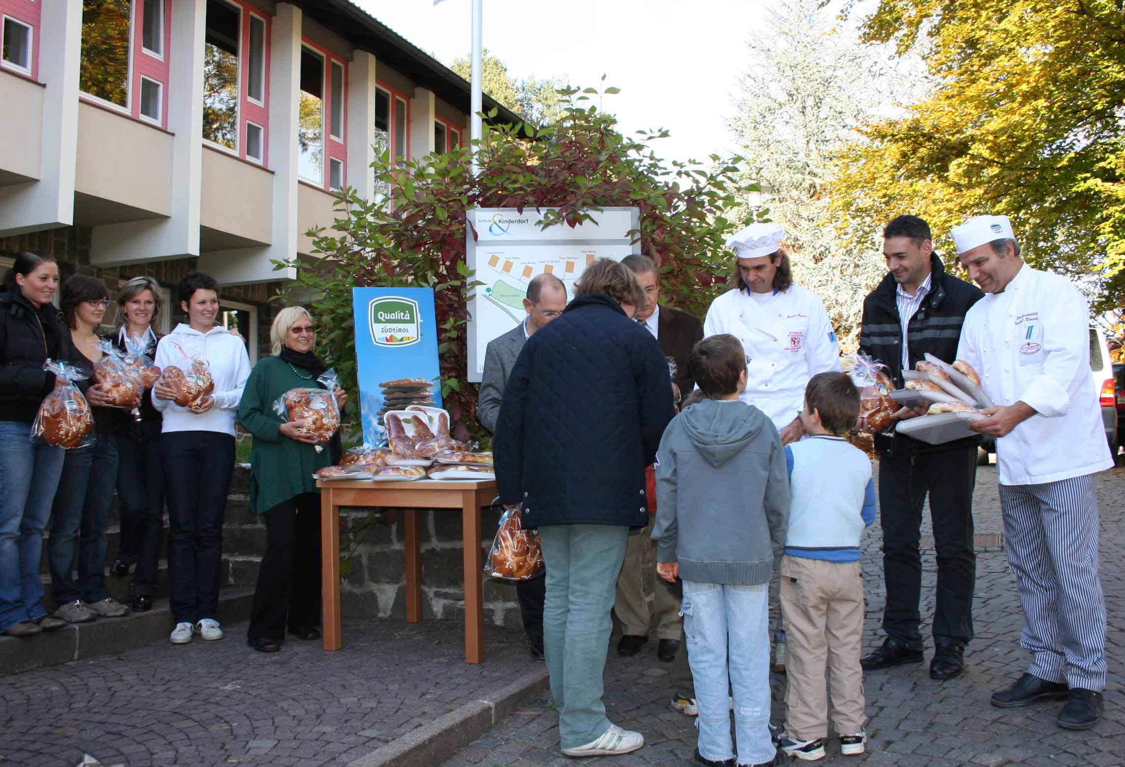 Für die über 50 Kinder und Jugendliche des Südtiroler Kinderdorfes und seine BetreuerInnen hatten sich die Südtiroler Bäcker und Konditoren, welche Produkte mit dem Südtiroler Qualitätszeichen herstellen, heuer eine besondere Überraschung überlegt. Vertreter der Bäcker- und Konditorenzunft brachten für jeden Bewohner des Südtiroler Kinderdorfes ein traditionelles Allerheiligenbrot vorbei. Das Kinderdorf betreut Kinder und Jugendliche, welche aufgrund verschiedener Schwierigkeiten im Elternhaus vorübergehend aufgenommen werden, um später wieder in die eigenen Familien zurückzukehren. Die Kinder und Jugendlichen leben in 4 Familienhäusern und 3 Wohngemeinschaften, wo sie von Kinderdorfmuttis, ErzieherInnen, PädagogInnen und FamilienassistentInnen betreut werden.