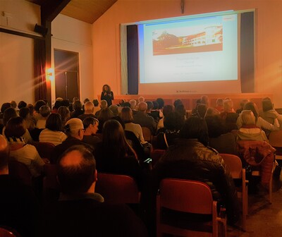 Im Bild 2: Gespannt folgten die Zuhörer den Ausführungen von Dr. Josef Schwitzer und einer Betroffenen. Vorne Ursula Thaler, Vizebürgermeisterin von Deutschnofen bei der Begrüßung