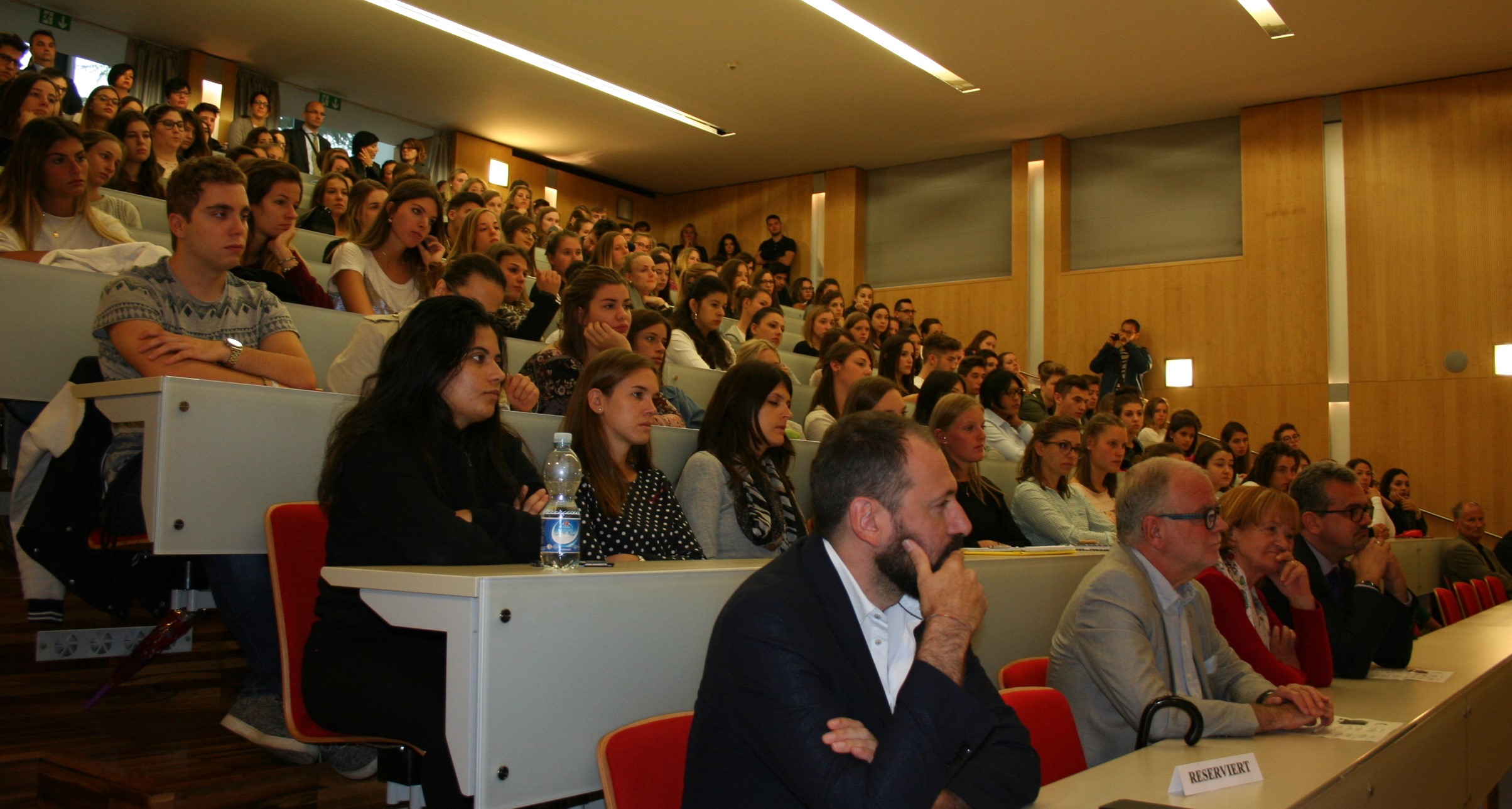 Der Festredner der heurigen Eröffnungsfeier war Prof. Peter P. Pramstaller, MD, Head of Institute for Biomedicine an der europäischen Akademie Bozen. Er sprach über die Frage „Sind Gesundheitsberufe noch Menschenberufe?“. Das Resümee seines Vortrages an die Studierenden: „Fachwissen ist wichtig. Doch ist es nicht minder wichtig immer neugierig zu bleiben und interessiert auch über den Tellerrand zu blicken. Die Studenten von heute sind diejenigen, welche morgen im Berufsleben Veränderungen vorantreiben können, wenn sie nur wollen. Versucht’s Euch einzubringen!“ Im Hinblick auf die demographische Entwicklung, dem wissenschaftlichen und technischen Fortschritt und das stets komplexer werdende Gesundheitssystem ist es wichtig mitzudenken und mitzugestalten!“ so die Botschaft des Arztes und Wissenschaftlers.
