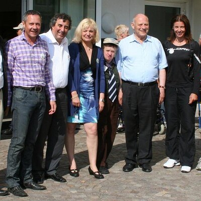 Bild 2 v.l.n.r.: Albin Kofler (Bürgermeister von Karneid), Luigi Spagnolli (Bürgermeister von Bozen), Ruth Jamnik (Strukturleiterin der Geschützten Werkstatt KIMM), Künstler Franz Josef, Landeshauptmann Luis Durnwalder, Olympiasiegerin Antonella Bellutti