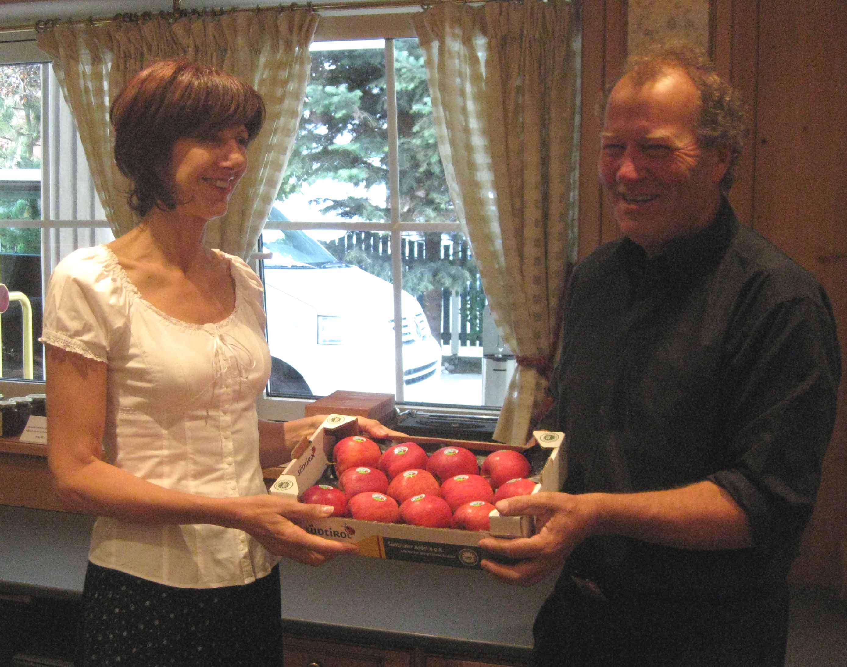 Frau Perathoner, die Chefin vom Hotel Feldhof in Naturns und Karl Perfler mit einem ApfelLiebe-Kistchen
