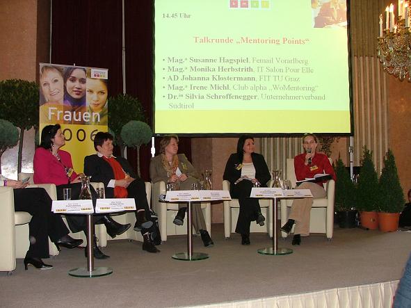 Im Rahmen der Veranstaltung gab es Anregungen, Tipps und Anleitungen, wie Frauen die berufliche Karriereleiter leichter erklimmen, wie den Frauen der Zugang zu „frauenuntypischen“ Berufen ermöglicht wird und wie sich Frauen der Herausforderung Beruf und Familie besser stellen können. Auf der Messe waren Mentoringanlaufstellen und -projekte aus ganz Österreich vertreten. Podiumsdiskussionen über Erfahrungen, Probleme und Paradebeispiele bereicherten das Programm. An einer Talkrunde nahm auch Silvia Schroffenegger, Projektmitarbeiterin des Unternehmerverbandes, teil. Vor allem das umfassende Konzept des Mentoringprojekts des Verbandes begeisterte die Frauen: Durch das Vorschalten einer Kompetenzbilanzierung vor der Mentorschaft und den Seminaren werden die Stärken und Schwächen der Teilnehmerinnen analysiert, sodass diese dann mit konkreten Vorstellungen und Fragen in die Beratungsgespräche mit der Mentorin gehen.