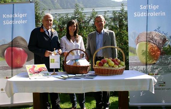 v.l.n.r.: Matthias Josef Gamper (Obmann des Südtiroler Apfelkonsortiums), Hillebrand Cornelia Schöpf (Kammerhof) und Georg Mayr (Obmann des Südtiroler Bauernbundes)