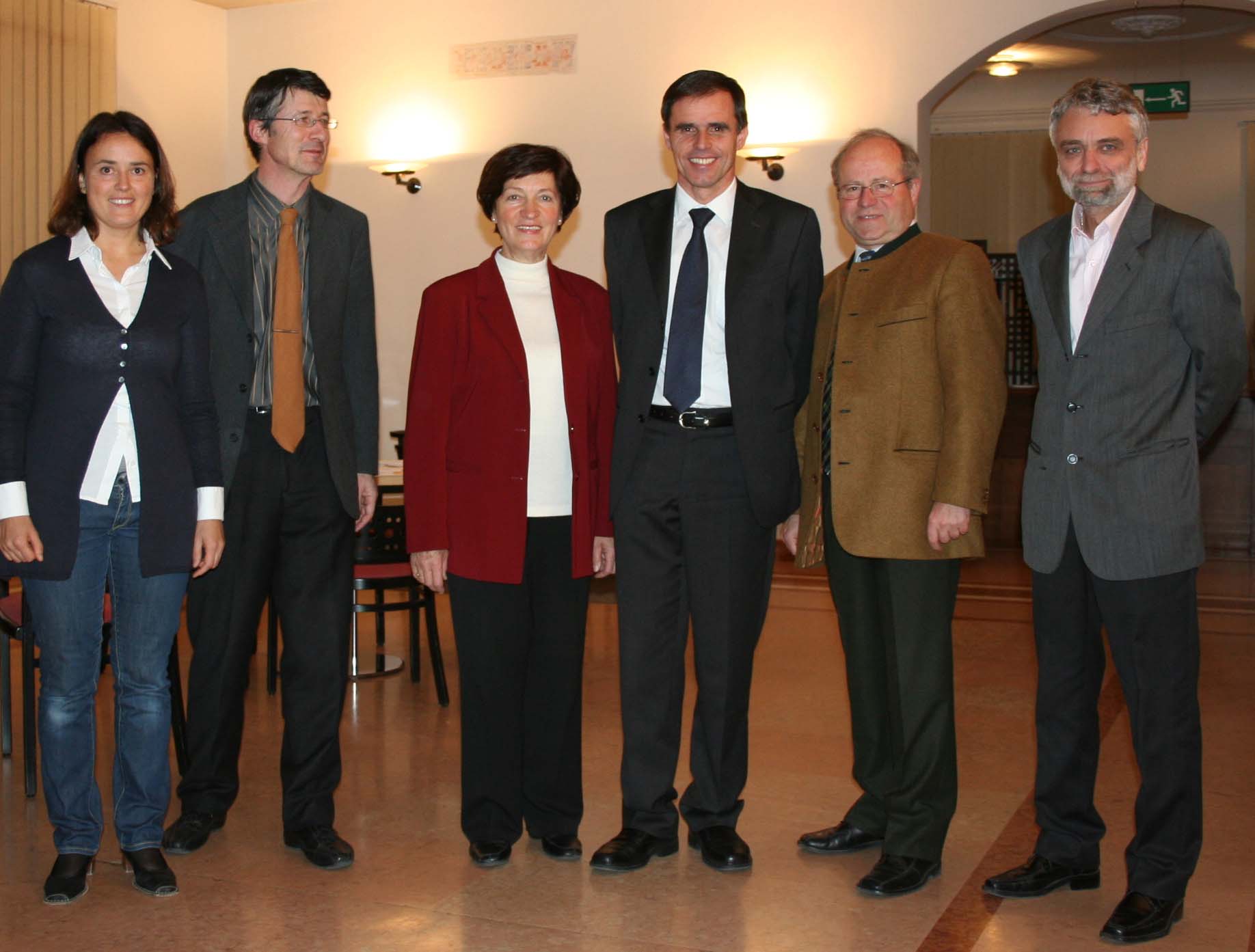 Annelies Pichler (KVW), Stefan Frötscher (Bezirkssekretär KVW Meran), Maria Kusstatscher (Landesvorsitzende des KVW), Landesrat Richard Theiner, Ignaz Ladurner (Präsident der Bezirksgemeinschaft Burggrafenamt) und Karl Tragust (Direktor der Abteilung Sozialwesen)
