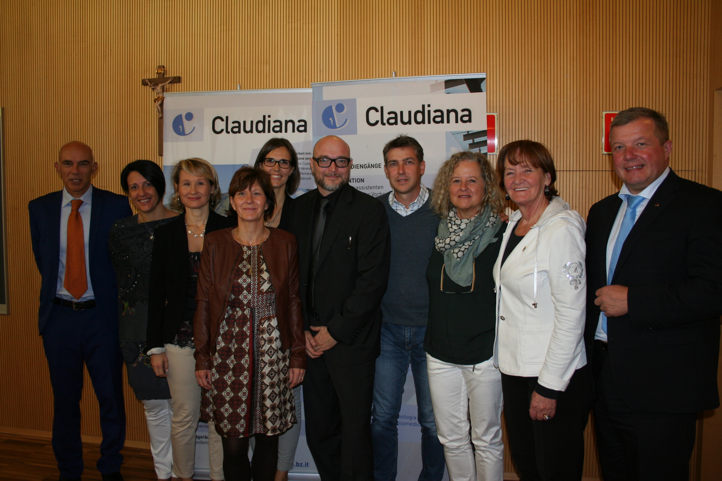 v.l.n.r. Guido Bocchio (Direktor der Claudiana), Barbara Tosetto (Koordinatorin Studiengang Ergotherapie), Carla Naletto (Koordinatorin Studiengang Physiotherapie), Astrid Kustatscher (Koordinatorin Studiengang Krankenpflege), Monica Gasser (Koordinatorin Studiengang Ernährungstherapie), Klaus Eisendle (Präsident der Claudiana), Marco Padovan (Koordinator Studiengang Dentalhygiene), Nevia Delladio (Koordinatorin Studiengang Orthoptik – Ophthalmologische Assistenz), Gesundheitslandesrätin von Südtirol Martha Stocker und Landesrat Univ.-Prof. Dr. Bernhard Tilg aus Tirol.