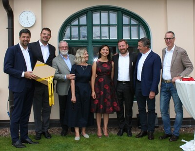 v.l.n.r. Helmut Tauber (Bezirksobmann Eisacktal und HGV-Vizepräsident), Hansi Pichler (Bezirksobmann Meran/Vinschgau), Hans und Marianne Holzner (Seniorchefs), Wolfgang und Monika Holzner (Chefs), Thomas Widmann (Landtagsvizepräsident) und Paul Lintner (Bürgermeister Ritten)