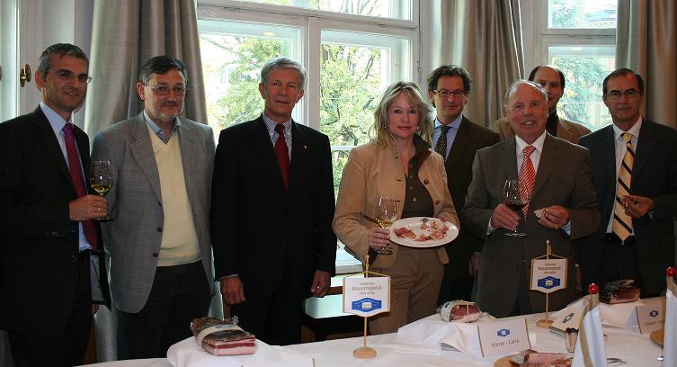 Im Bild 1 v.l.n.r.: Paul Zandanel (Marketingleiter der EOS/Handelskammer Bozen), Franz Blaas (Betreuung & Beratung der Bergbauern in Bezug auf die Schweinezucht/Dienststelle Bergbauernberatung, Abt. 22 der Autonomen Provinz Bozen), Hans Berger (Landesrat für Landwirtschaft der Autonomen Provinz Bozen), Christine Mayr (Präsidentin der Sommeliervereinigung Südtirol), Franz Mitterrutzner (Geschäftsführer des Consortiums Südtiroler Speck), Benedikt Gramm (Präsident der EOS der Handelskammer Bozen), Markus Gasser (Vizepräsident des Consortiums Südtiroler Speck) und Werner Frick (Landesrat für Handwerk, Industrie und Handel der Autonomen Provinz Bozen)