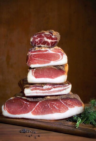 Im Bild 2: Die verschiedenen Teilstücke des Südtiroler Bauernspecks ggA, von oben nach unten: Schopf, Schulter, Karree, Bauch und Schlegel
