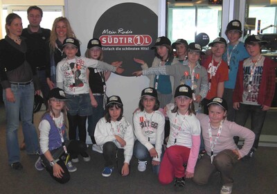 Im Bild: v.l.n.r. Anna Wenter, Martin Niedermair (Produzenten im Funkhaus von Südtirol 1 und Radio Tirol), Renate Urthaler (Deutsch- und Musiklehrerin der Grundschule St. Pauls) mit den Schülern der Klasse 4b bei der Aufnahme des Apfelsongs im Funkhaus von Südtirol 1 und Radio Tirol