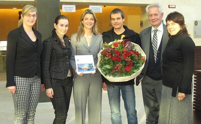 Veronika Bauer (Assistentin Marketing der Therme Meran), Manuela Zischg (Marketingleiterin der Therme Meran), Adelheid Stifter (Direktorin der Therme Meran), Markus Kofler (der 300.000ste Besucher), Manfred König (Präsident der Therme Meran), Sonia Rungg (Eventmanagerin der Therme Meran)
