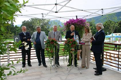 Es ist soweit: Nachdem 5.900 Sträucher, 300 verschiedene Bäume, 478 Rosen unterschiedlicher Gattungen, 900 Seerosen und vieles andere mehr über Monate gepflanzt wurden, wird der Park der Therme Meran nun seiner Bestimmung übergeben. Die Naturoase im Herzen der Stadt kann ab nun von den Thermenbesuchern genutzt werden. Anlässlich der Eröffnung des Thermenparks haben sich Prominenz und politische Vertreter zur ersten Parkbegehung eingefunden. Landeshauptmann Luis Durnwalder schnitt symbolisch gemeinsam mit dem Präsidenten der Therme Meran AG Manfred König mittels Heckenschere das Band zur grünen Oase von Meran durch. Dekan Albert