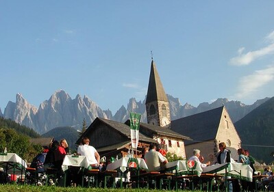 Das Südtiroler Speckfest in Villnöss, im Hintergrund die Geisler Spitzen