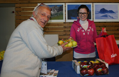 Armando Trovati, der Koordinator der Pressefotografen bei der Übergabe der Vinschger Äpfel durch eine Mitarbeiterin des Pressebüros im Pressezentrum in St. Christina. Trovati hat übrigens seit 44 Jahren jedes Weltcuprennen in Gröden verfolgt bzw. fotografiert und zählt somit wohl zu den fleißigsten und routiniertesten Fotographen der Südtiroler Skiweltcup-Szene.