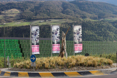 im Bild 2: In Latsch begrüßt man die Radsportler mit rosa Fahnen