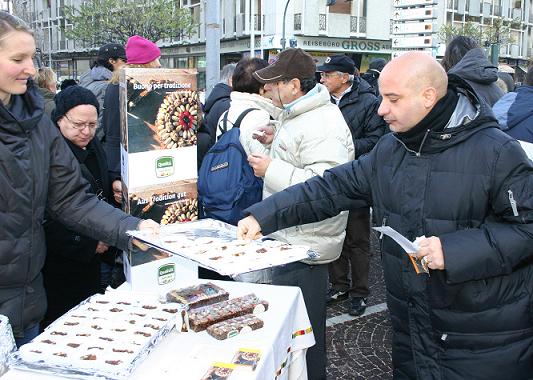 Am Nikolaustag hat die EOS der Handelskammer Bozen die Besucher des Weihnachtsmarktes in Bozen mit einem süßen Willkommensgruß überrascht. Gegenüber der Handelskammer am Eingang zum Parkhaus Bozen Mitte wurden die Leute eingeladen, die typische Südtiroler Weihnachtsspezialität zu probieren, den Zelten.