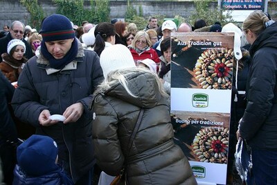 Einheimische wie Auswärtige zeigten sich gleichermaßen erfreut über die unerwartete Gaumenfreude. Wobei die Neugier der Nicht-Südtiroler auf den ihnen meist noch unbekannten Zelten natürlich größer war. Und genau dies war Sinn und Zweck der Aktion. Insbesondere diejenigen Weihnachtsmarktbesucher, die von außerhalb Südtirols kamen, sollten auf den Zelten mit dem Südtiroler Qualitätszeichen aufmerksam gemacht werden. „Die Reaktionen der Leute waren durchweg positiv. Zum einen haben sie sich sehr über den süßen Willkommensgruß gefreut und zum anderen hat ihnen der Südtiroler Zelten einfach gut geschmeckt. Bislang wird Zelten nur in kleinen Mengen exportiert und Südtirols Bäcker und Konditoren produzieren vorwiegend für ihre Stammkunden und den heimischen Markt. Verkostungsaktionen wie diese helfen dabei, den Zelten über Südtirols Grenzen hinaus bekannt zu machen“, sagt Cilli Seehauser von der EOS, die diese Verkostungsaktion organisiert hat. Der Zelten gehört zu den Spezialitäten, die mit dem Südtiroler Qualitätszeichen versehen sind. Das Zeichen „Qualität Südtirol“ bürgt für die hohe Güte des Zelten und dafür, dass er entsprechend der Südtiroler Traditionen hergestellt wird.