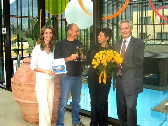 Adelheid Stifter (direttrice delle Terme Merano), Rudi e Irmgard Stecher (100.000a visitatrice) e Manfred König (presidente delle Terme Merano)