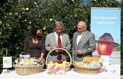 Da sx. a dx.: la dea della fortuna Cornelia Hillebrand-Schöpf (Kammerhof), Georg Mayr (Presidente dell’Unione Agricoltori e Coltivatori diretti sudtirolesi) e Matthias Josef Gamper (Presidente del Consorzio Mela Alto Adige)