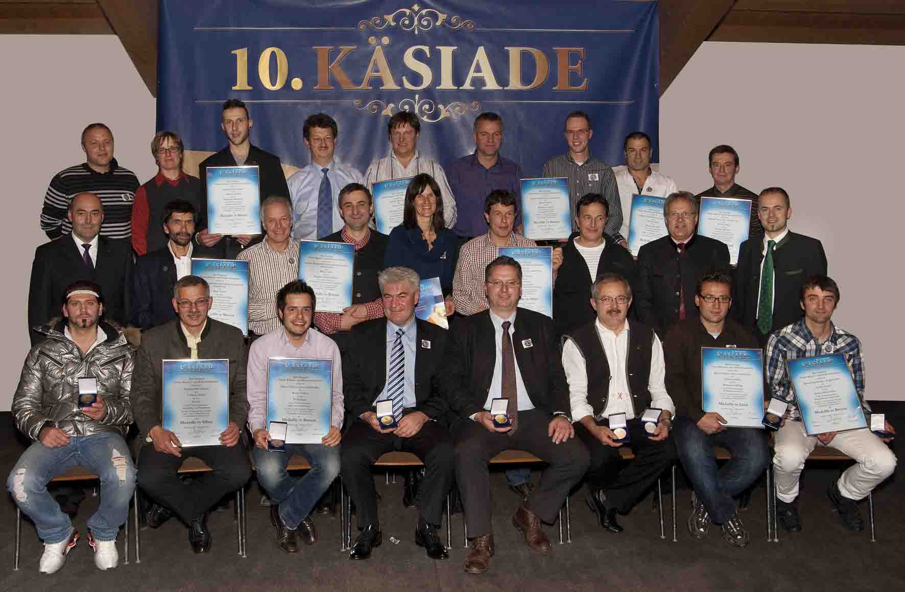 I produttori caseari altoatesini con le medaglie e gli attestati conquistati. In seconda fila il primo a sinistra è Sebastian Wimmer (Presidente del Verband der Käserei- und Molkereifachleute, associazione austriaca che riunisce esperti dell’arte lattiero-casearia) mentre il primo a destra è Josef Hechenberger (Presidente della Camera dell’Agricoltura del Tirolo); al suo fianco il Deputato austriaco Hermann Gahr. In seconda fila la 5a da sinistra è Annemarie Kaser (Direttrice della Federazione Latterie Alto Adige)
