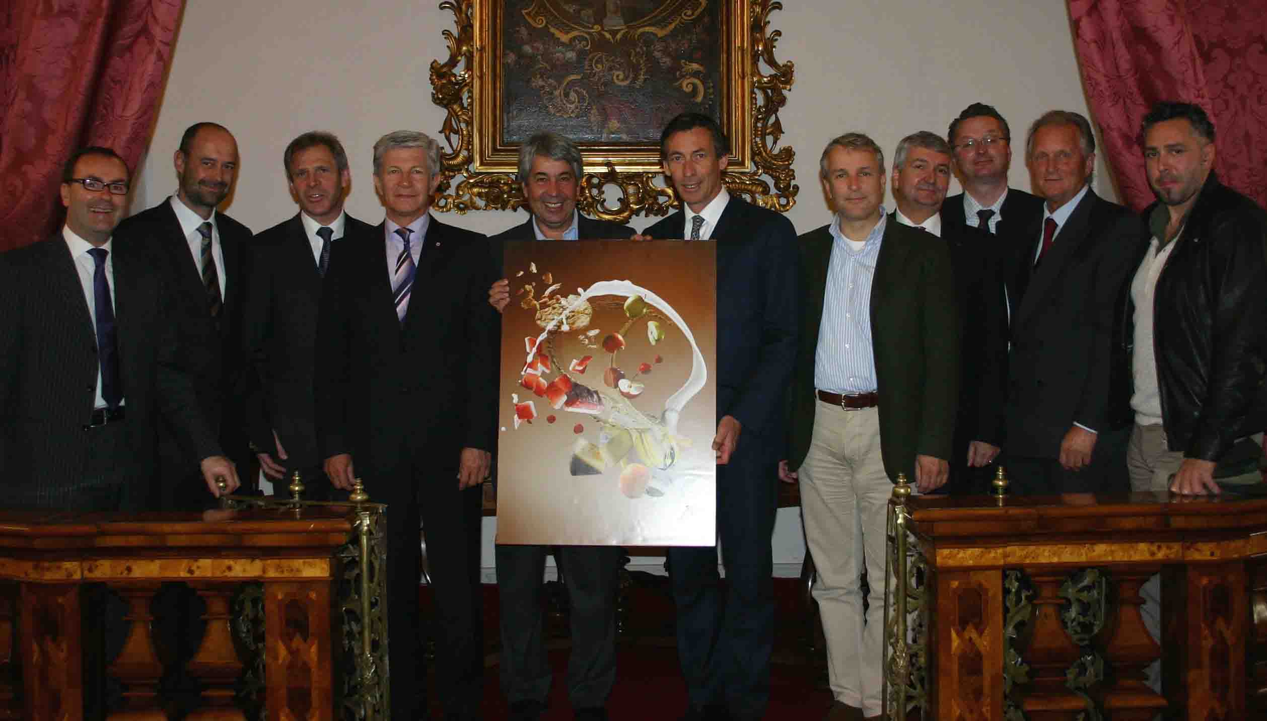 Armin Dissertori (Presidente del Consorzio Vini Alto Adige), Hansjörg Prast (Direttore EOS), Christoph Engl (Direttore SMG), Assessore Hans Berger (Vicepresidente della Provincia Autonoma di Bolzano), Federico Giudiceandrea (Presidente EOS), Assessore Thomas Widmann (Assessore Provinciale dell’artigianato, l’industria, il commercio, la mobilità e il personale), Klaus Ladinser (Vicesindaco della città di Bolzano), Georg Kössler (Presidente del Consorzio Mela Alto Adige), Joachim Reinalter (Presidente della Federazione Latterie Alto Adige), Franz Senfter (Presidente Consorzio Tutela Speck Alto Adige) e Roland Trettl (Chef blasonato Hangar 7, Salisburgo)