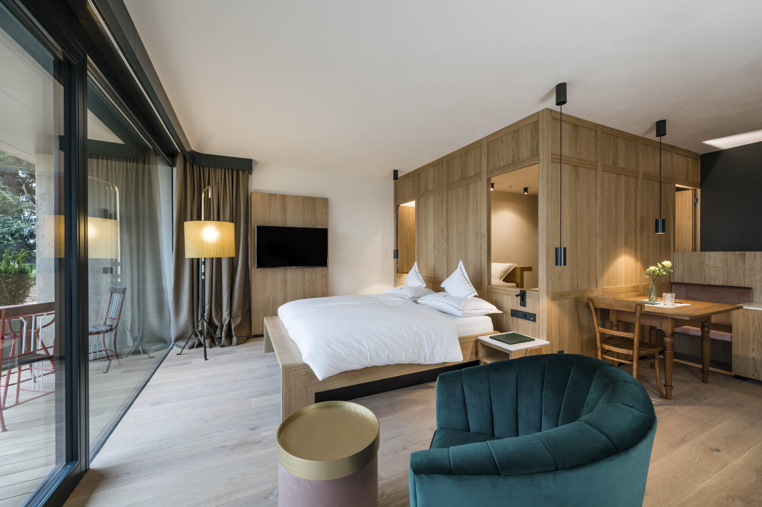 Le 11 nuove suite Eden nell’ala denominata “Bergmeister” hanno la particolarità di godere di una vista sublime. Ogni suite Eden dispone infatti di una terrazza con giardino e,grazie ai materiali d’arredo selezionati con cura, assicura il massimo comfort abitativo, rimanendo immersi nel parco dell’hotel. Le suite hanno tutte un aspetto moderno e le 4 suite di 70m² ciascuna e le 7 junior-suite di 45m² offrono agli ospiti ampi spazi per rigenerarsi. Del resto all’hotel Holzner ogni camera ha un carattere unico. Ma le differenze si estendono anche alle 20 categorie di camere. La maggior parte delle camere dell’hotel è arredata con mobili originali del 1908, accuratamente restaurati. Priorità assoluta in fase di progettazione e costruzione è stata data, ma viene data tuttora, alla sostenibilità ambientale, scegliendo un sistema costruttivo che preservi la struttura anche per le future generazioni e che faccia uso dei materiali impiegati già 110 anni fa. Sempre nell’ottica della sostenibilità ambientale, dal 2008 l’intero hotel e i suoi impianti, ma anche gli alloggi privati della famiglia Holzner, sono serviti da un impianto di riscaldamento a biomassa con produzione di energia pulita. E in questo paradiso rientra anche un ampio parco con una particolare vista panoramica sullo scenario alpino circostante.