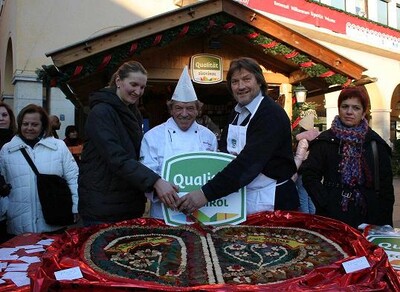 Ieri lo zelten con il marchio di qualità Alto Adige ha fatto il suo ingresso trionfale al mercatino di Natale di Bolzano. Presso lo stand dei prodotti di qualità è stato affettato il più grande zelten mai sfornato dai nostri pasticceri.