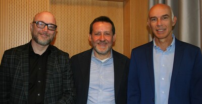 Foto 1: da sinistra il Prof. Mag. Dr. Klaus Eisendle (presidente della Claudiana), il relatore ufficiale Prof. Peter P. Pramstaller (MD, Head of Institute for Biomedicine, Accademia Europea di Bolzano) e il Dott. Guido Bocchio (direttore della Claudiana).