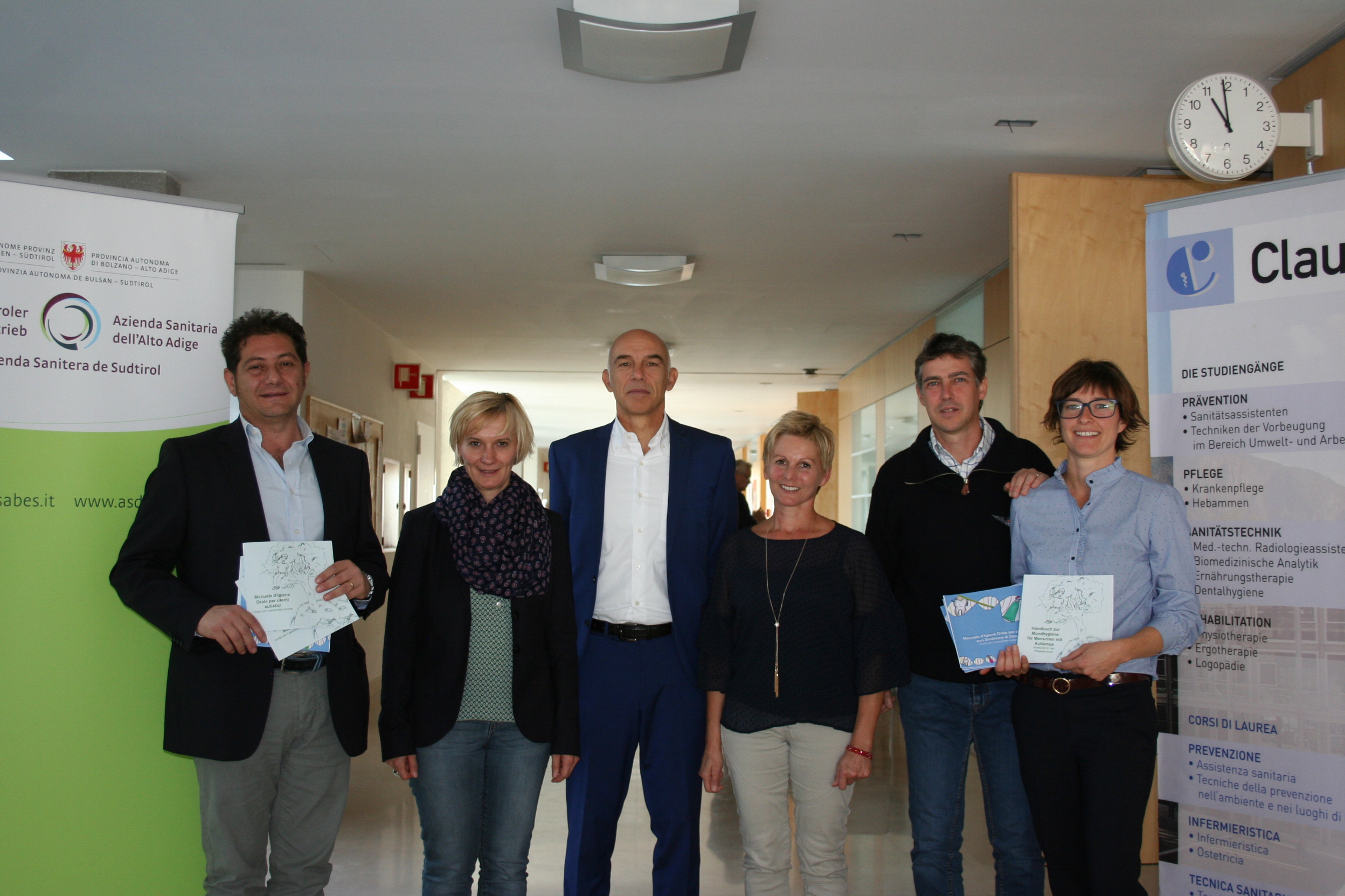 Da sinistra a destra: il dott. Massimo Roperti (coordinatore del progetto e tutor presso la Claudiana), Marianne Siller (direttrice tecnico-assistenziale dell’Azienda sanitaria dell’Alto Adige), Guido Bocchio (Direttore della Claudiana), Angelika Stampfl (presidente dell’AEB – Associazione genitori di persone in situazione di handicap), dott. Marco Padovan (responsabile del corso di igiene dentale presso la Claudiana) e la dott.ssa Manuela Perli (coordinatrice del progetto e tutor presso la Claudiana)