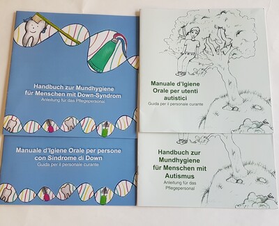 Foto 3: gli opuscoli “Manuale d’igiene orale per persone con sindrome di Down” e “Manuale d’Igiene orale per utenti autistici“ sono disponibili in italiano e tedesco.