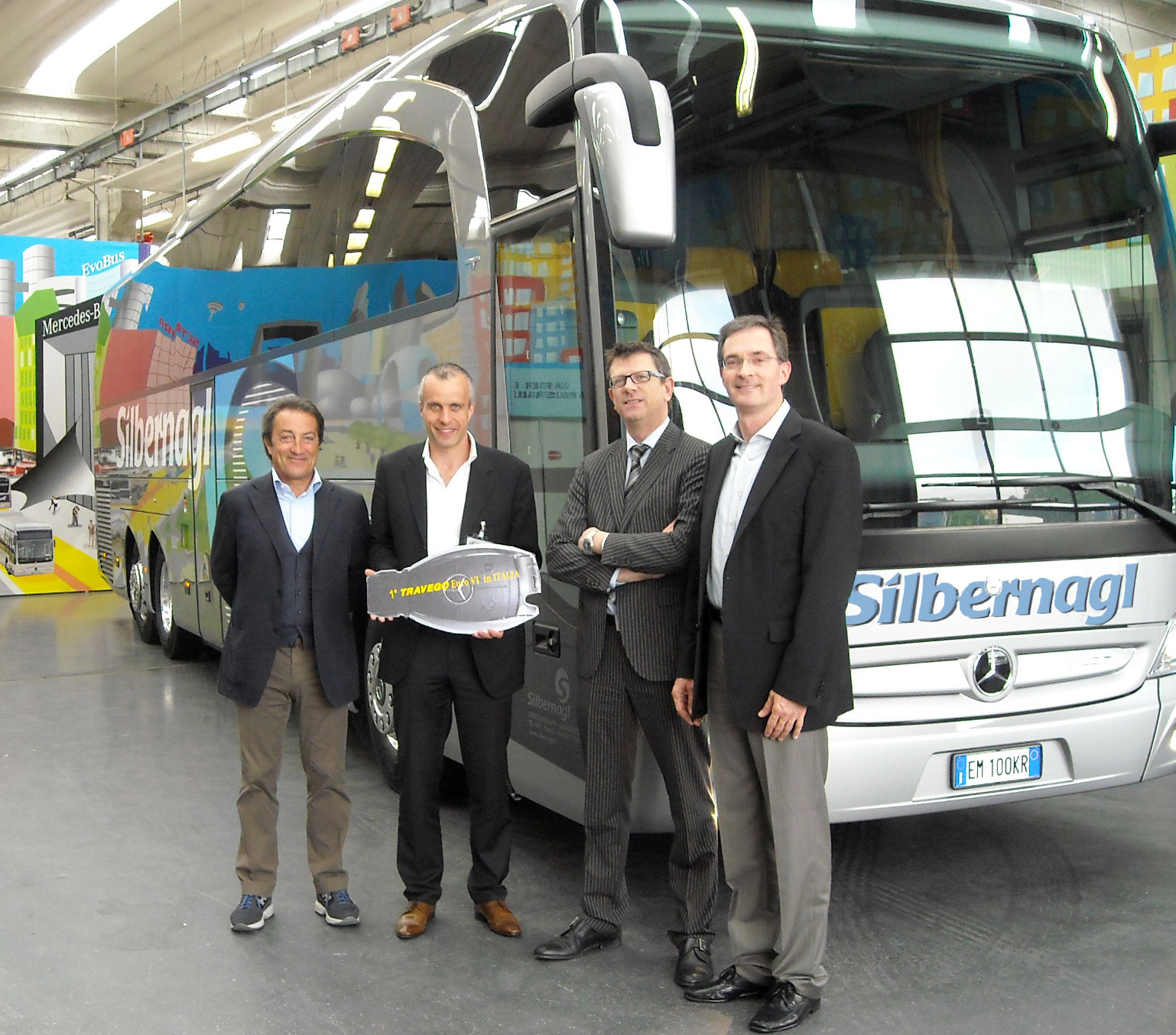 Da sinistra a destra: Lorenzo Bencivenni (venditore autobus evobus italia), Markus Silbernagl (direttore dell’azienda di trasporti Silbernagl), Riccardo Cornetto (direttore alle vendite degli autobus marca Mercedes in Italia) e Holger Dürrfeld (direttore di Evobus Italia)