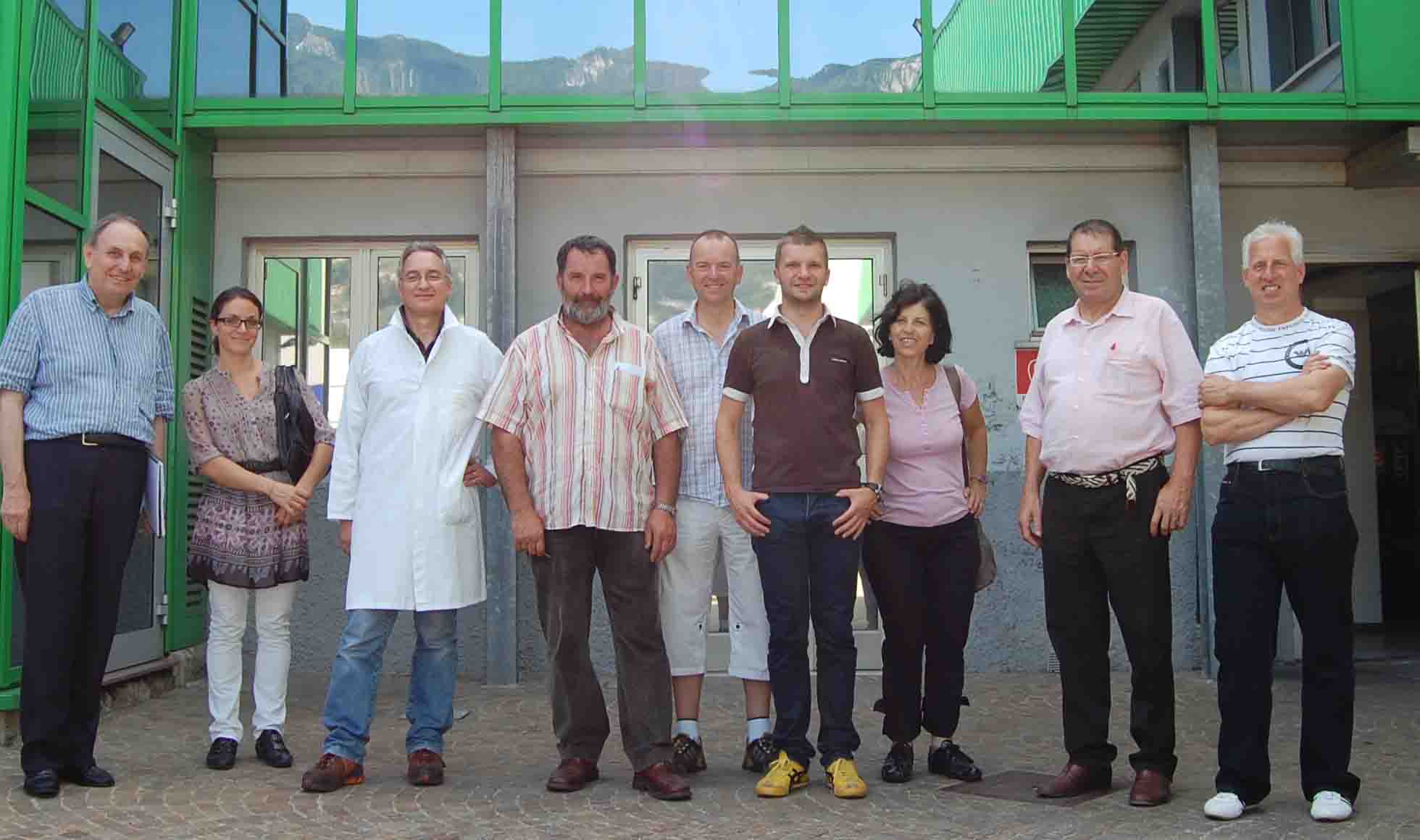 Da sinistra a destra: Otto Unterholzner (esperto in prodotti alimentari), Anna Pichler (collaboratrice di Otto Unterholnzer), Giampaolo Toccoli (Trentofrutta), Karl Luggin e Alfons Bologna (entrambi produttori di succo di mela), Thomas Gänsbacher e Hildegard Mayerhofer (entrambi dell’EOS), Carlos Soini e Giuseppe Bortollon (entrambi dell’azienda produttrice Soini Quinto & Figli)